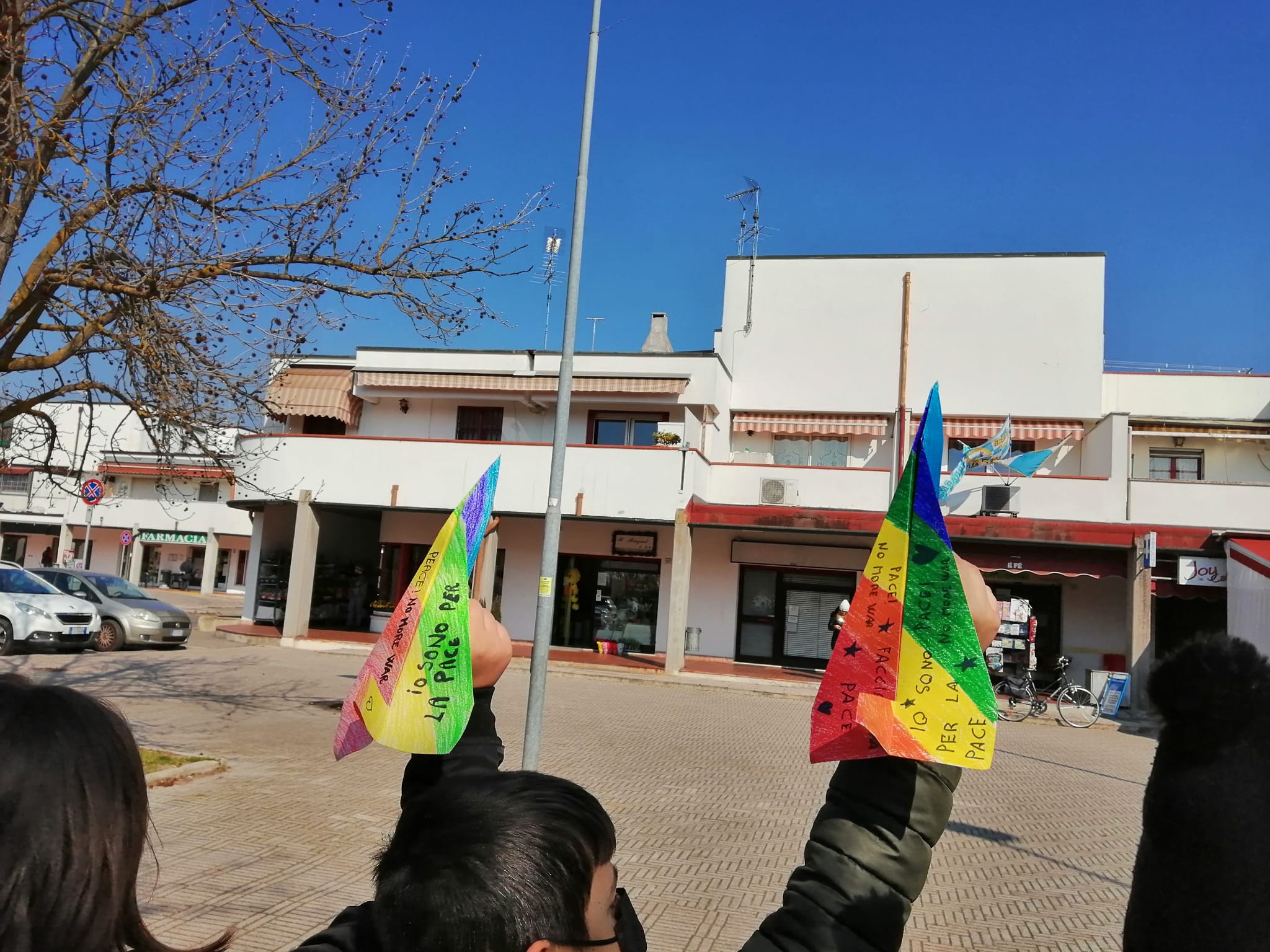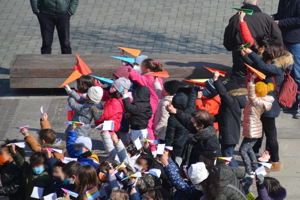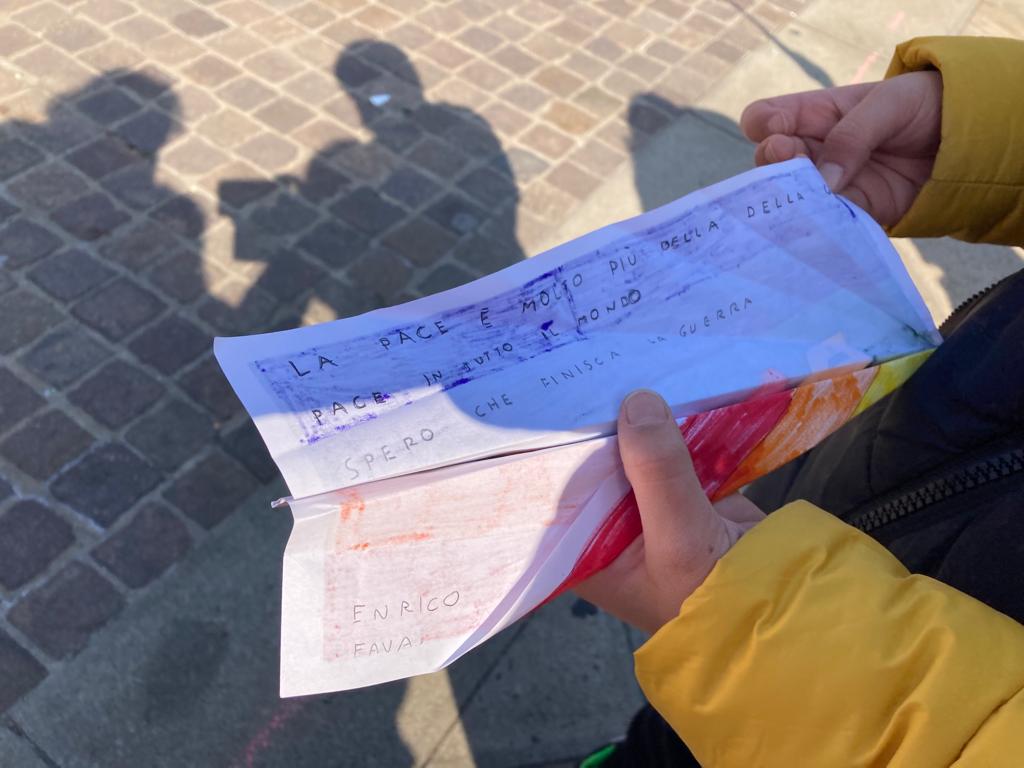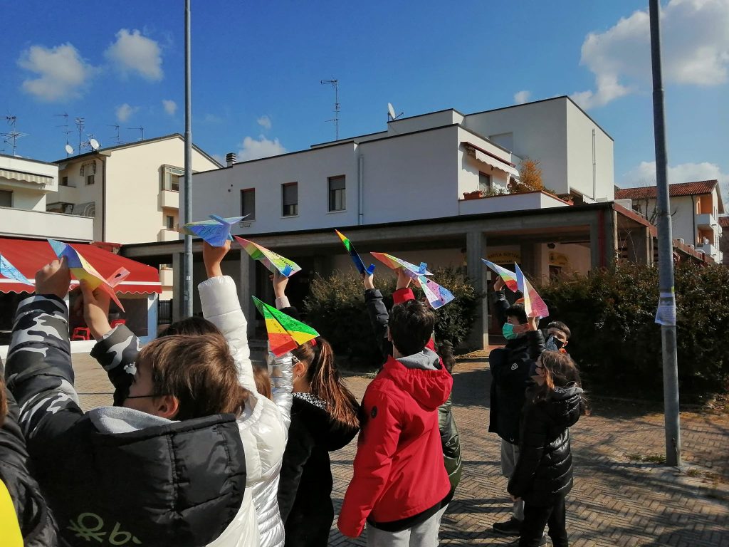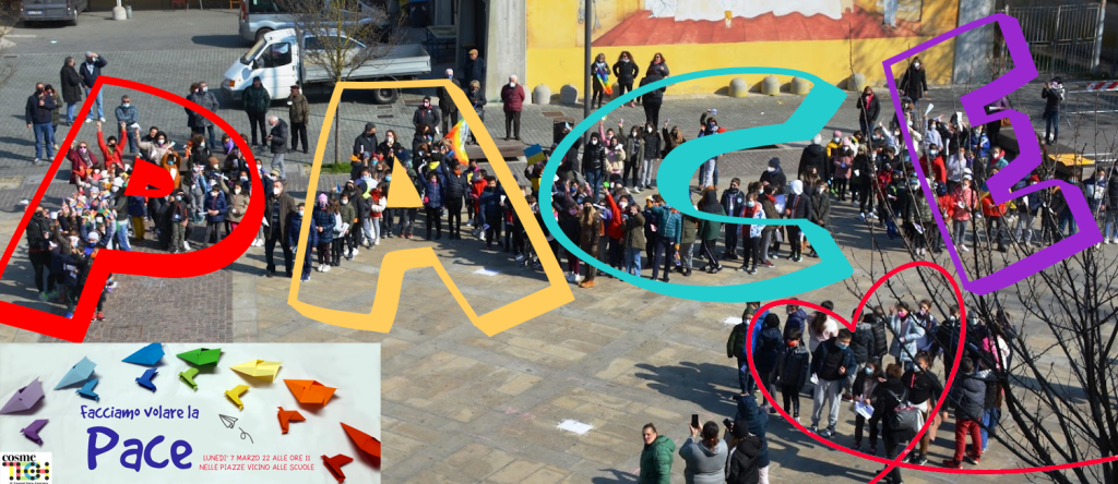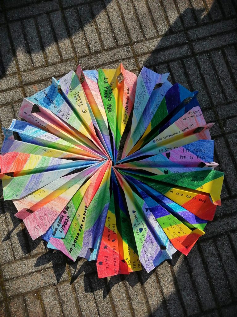 Nello stesso momento ciascuno di noi lancerà un aereoplanino di carta che riporta un messaggio di pace, poi raccoglieremo l’aeroplanino che è caduto più vicino a noi ed in tal modo ci scambieremo messaggi di pace. Potremo poi donare i nostri messaggi a chi abita nei nostri quartieri, agli esercizi commerciali che incontreremo nel nostro tragitto, ai nostri vicini di casa, alle persone che ci sono care…
