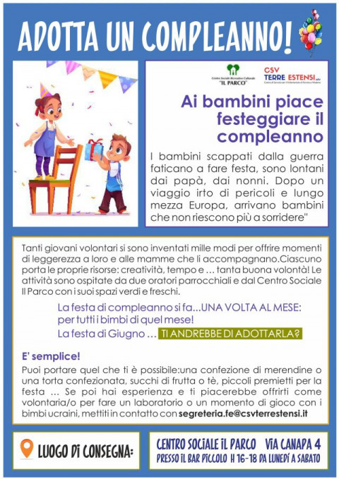 Ti piacerebbe partecipare ad adottare un compleanno? Per farlo puoi portare ciò che ti è possibile, una confezione di merendine, una torta confezionata, succhi di frutta o tè, piccoli premietti per la festa…, dal lunedì al sabato, ore 16-18 presso il Bar Piccolo al centro sociale Il Parco, in via Canapa 4 a Ferrara.