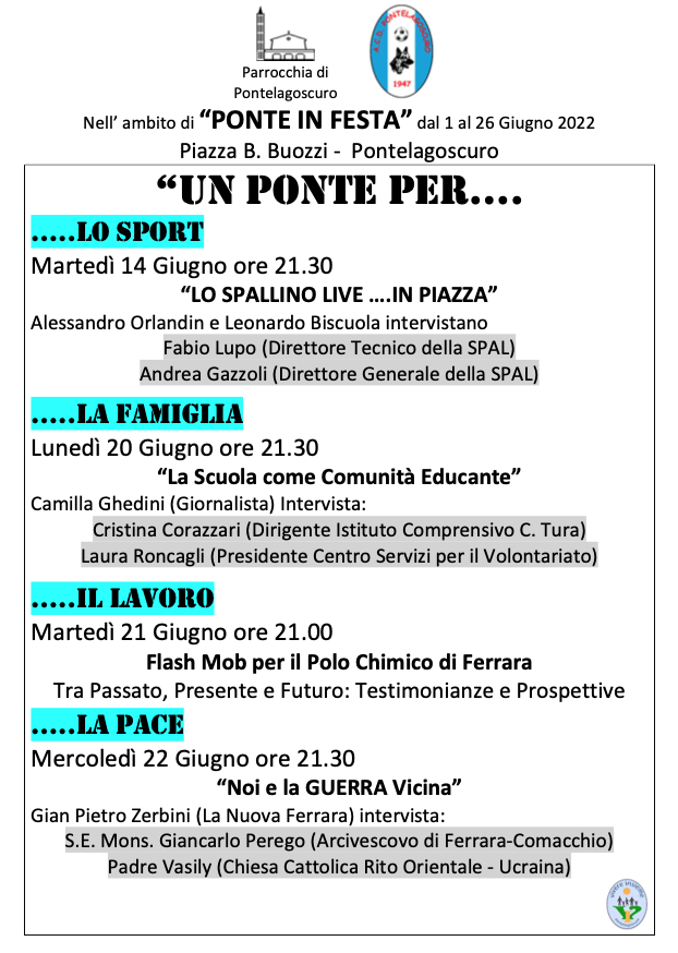 aggiornato il 5 Giugno 20224 Giugno 2022Il 4 giugno 22 – C’è aria di festa a Pontelagoscuro! per festeggiare e scoprire assieme i progetti futuri