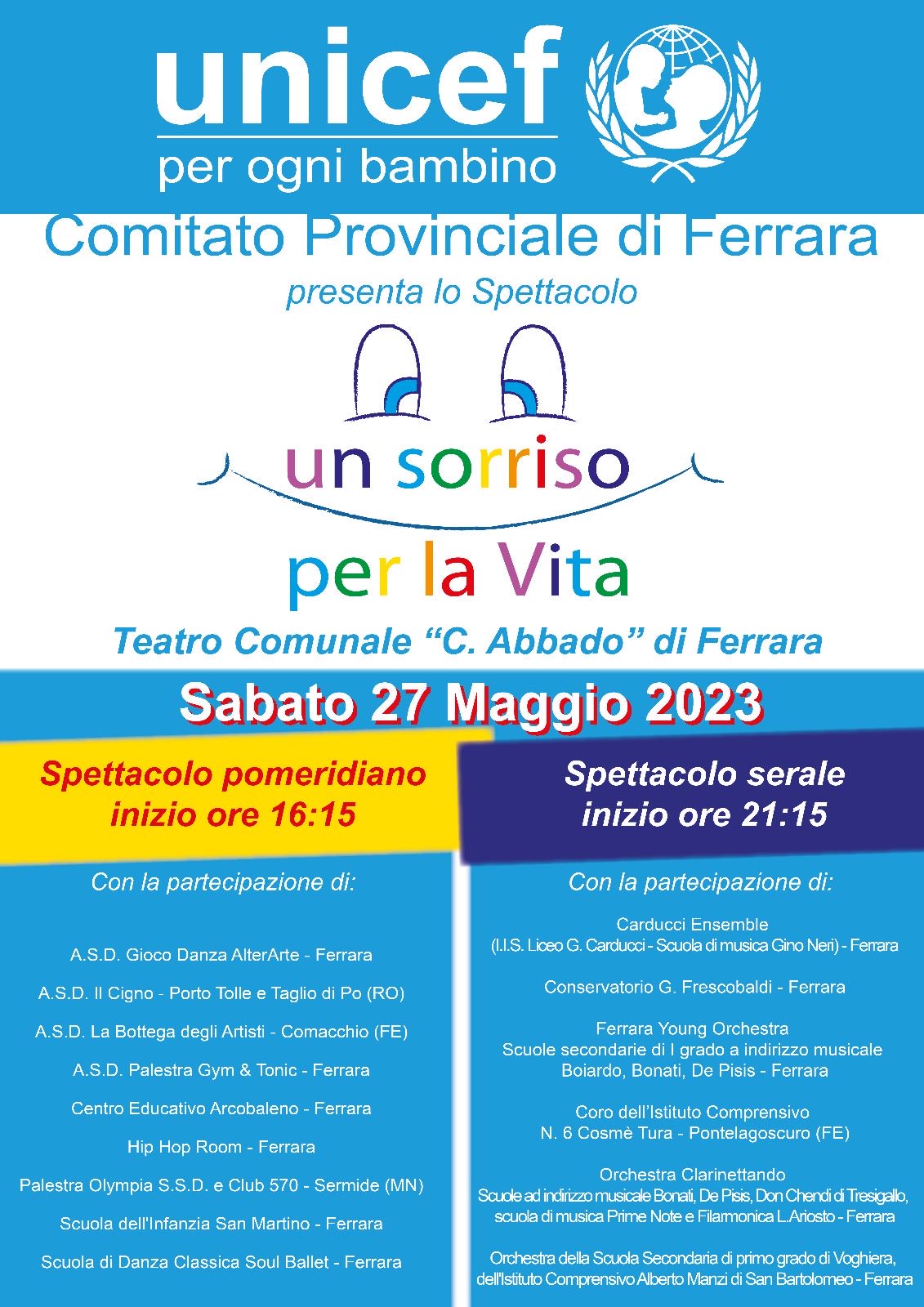 Il nostro coro, sabato 27 Maggio scorso, ha avuto il piacere di partecipare al concerto di beneficenza organizzato dall’UNICEF presso il Teatro Comunale di Ferrara.