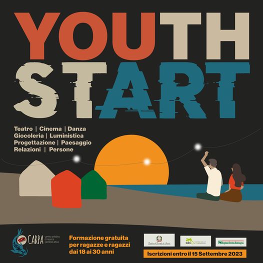 YouthStart è un progetto di C.A.R.P.A. Aps vincitore del bando YOUz Officina indetto da Regione Emilia-Romagna, Dipartimento per le Politiche giovanili, Servizio Civile Universale in collaborazione con Teatro Nucleo (FE), Mestieri del Palco (NA), Lanciarte (RO), Accademia Internazionale della Luce (PG). Grafica di Studio Maat
